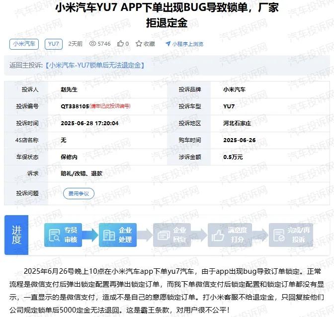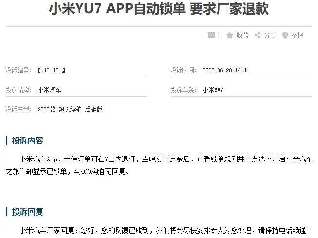 有用户投诉:“小米汽车app,宣传订单可在7日内退订,车当晚交了定金后,查看锁单规则并未点选‘开质启小米汽车之旅’却显示已锁单,与400沟网通无回复。”