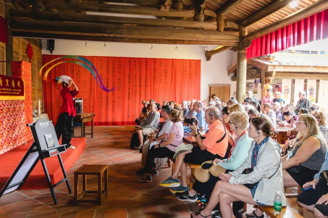 外国游客在厦门惠和石文化园欣赏木偶戏。