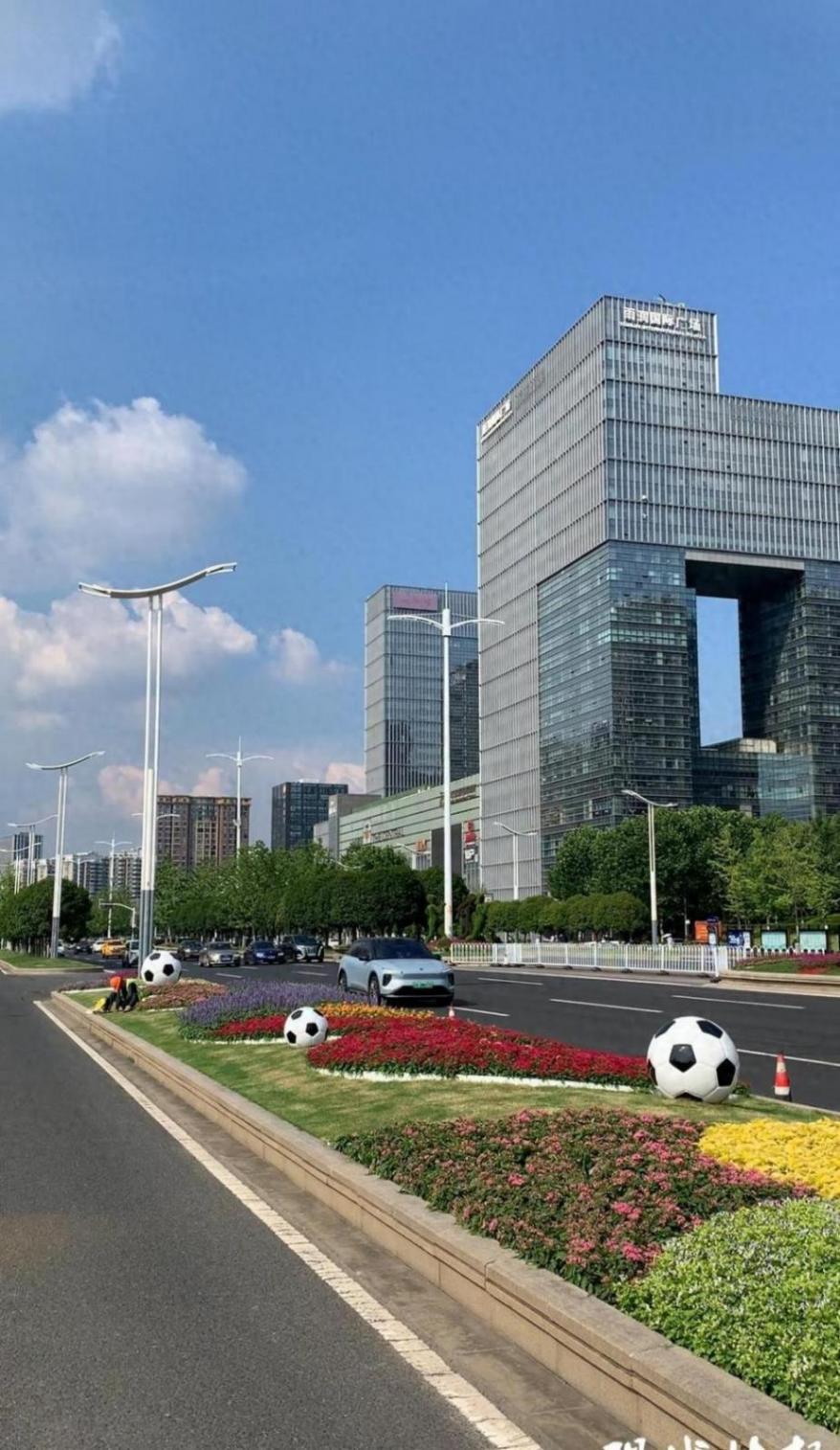 门口的足球装饰挺新潮,估计是想拉近和周边居民的关系。以前奥体只有大赛才热闹,现在连苏超都搞得这么隆重,可能想让市民更多参与本地赛事吧。