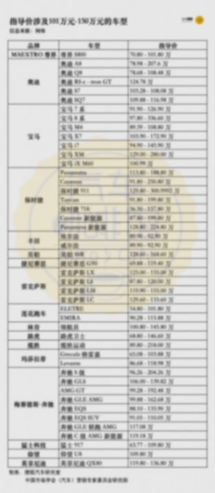 搜狐汽车整理了指导价在101万元-150万元之间的车型发现,其中,奥迪、宝马、保时捷、、奔驰涉及的车型最多,分别为5款、7款、7款、4款、8款。