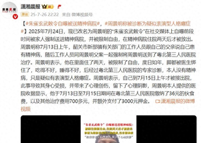 刷朋友圈的时候,看到一个挺扎心的事儿,说是朱雀玄武敕令,也就是现在叫周景明那个小伙,他最近把自己被“误送”进精神病院的遭遇,全都在网上说出来了。事发时间差不多是7月13号,人家那会儿正在家待着,突然自家父亲和当地工作人员就一块上门了,说他有精神方面的问题,直接就把他抓上车送进了医院。