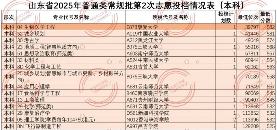 此次本科征集志愿中,最低投档位次高居榜首的是康复大学的生物医学工程专业,1个征集志愿计划,投档位次为39797,对应分数为582,这个位次超出康复大学临床医学在普通类常规批第1次志愿中投档线1分。根据省招考院此前发布的数据,在普通类常规批第1次志愿中,康复大学临床医学专业最低投档位次为40841,对应分数为581分;生物医学工程当时的最低投档位次为51847,对应分数为571分。