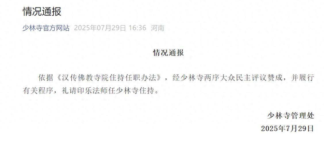 7月29日,少林寺官方网站发布情况通报,该通报写道:依据《汉传佛教寺院住持任职办法》,经少林寺两序大众民主评议赞成,并履行有关程序,礼请印乐法师任少林寺住持。