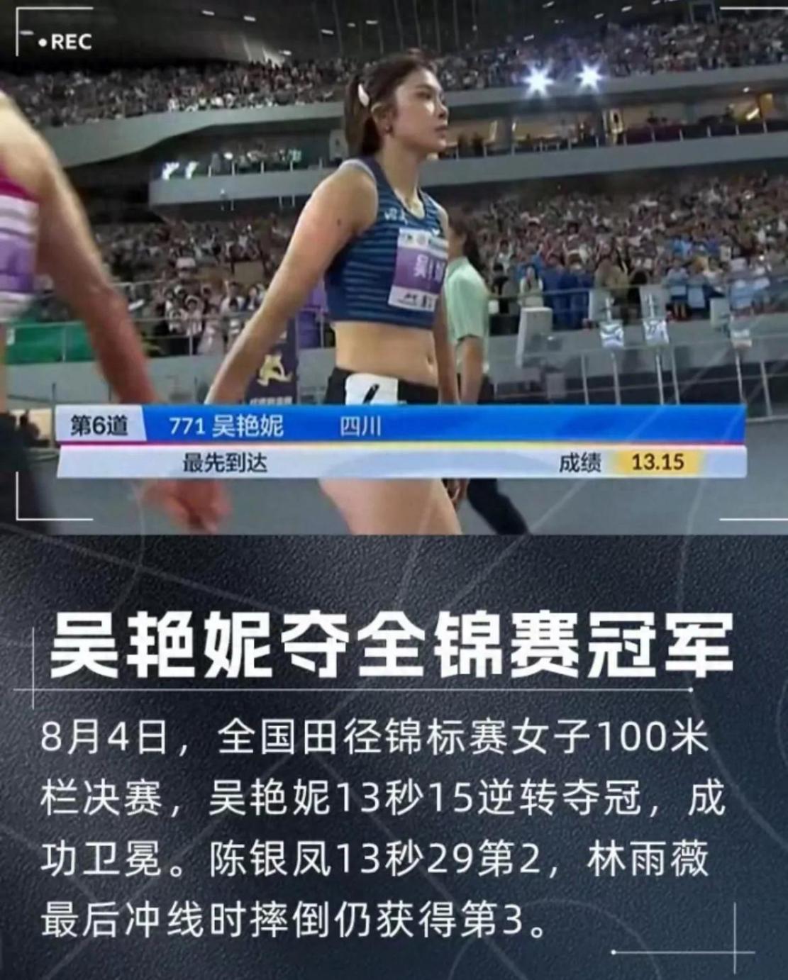 邻道的福建名将林雨薇受其影响,终点线前踉跄摔倒,手臂擦伤渗血,仍咬牙以13秒29拼下铜牌。而四川名将吴艳妮在对手接连失误中稳守节奏,最终以13秒15的成绩卫冕冠军,成就该项目史上首个三连冠。