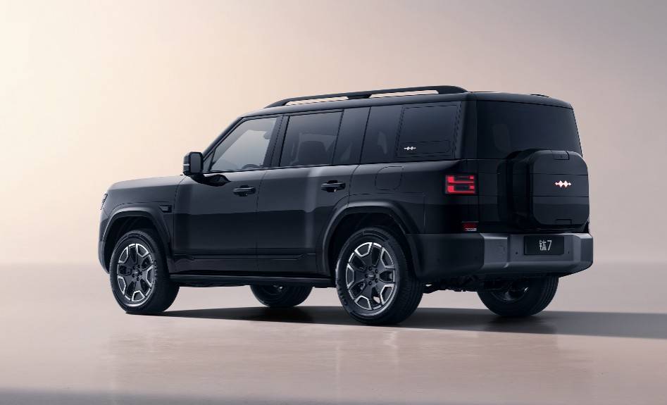 侧面来看,新车侧面采用较为平直的设计,笔直的腰线从车头贯穿至车尾,配合宽大的轮眉,野性十足。在车身尺寸方面,钛7车长4999mm,宽1995mm,高1865mm,轴距为2920mm。从尺寸来看,新车大于豹5,等同于豹8,远超同级SUV。车尾部分,新车尾灯组造型与前大灯组相呼应,方盒子越野车标志性的“小书包”也没有缺席。