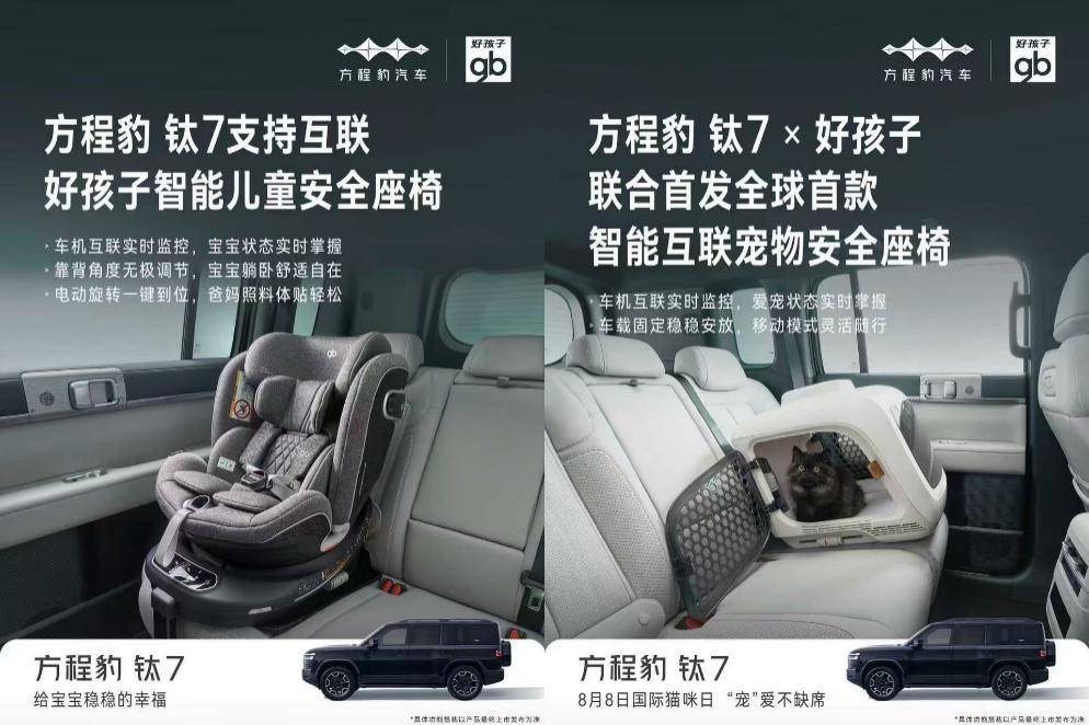 值得一提的是,钛7近日又公布了首发首搭的比亚迪新一代智慧生态,并于8日当天还官宣了,方程豹品牌与gb好孩子联合首发的钛7智慧生态产品:智能儿童安全座椅、全球首款智能互联宠物安全座椅,让座舱体验再升级,小孩子与毛孩子都一宠到底,预计后续钛7将会有更多的座舱黑科技发布。