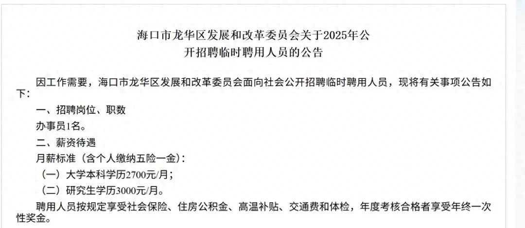 8月11日,海口市龙华区发展和改革委员会发布了《海口市龙华区发展和改革委员会关于2025年公开招聘临时聘用人员的公告》。公告中的月薪标准(含个人缴纳五险一金)为:大学本科学历2700元/月,研究生学历3000元/月。该薪资引发不少网友讨论。