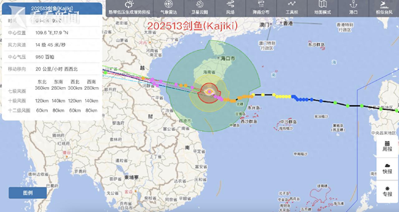 台风“剑鱼”(强台风级),19时中心位于北纬17.9度、东经109.6度,即在三亚市东南方向约40公里的海面上,中心附近最大风力有14级(45米/秒)。
