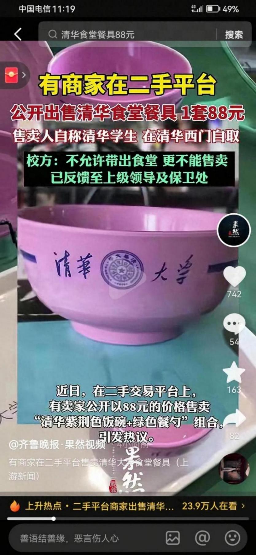 这几天网上吵得沸沸扬扬,有人在闲鱼上卖清华食堂的饭碗勺子。一套标价88元,还说什么“紫荆色饭碗买都买不到”。记者查到确实有人卖,有的能自取有的能快递,买家想买的也有好几十人。