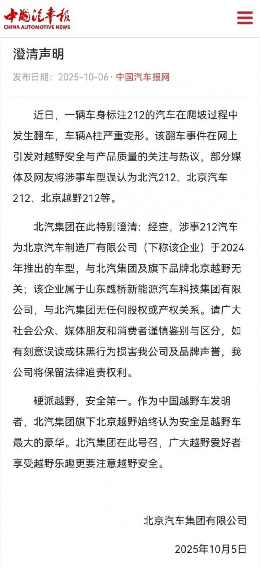 ——“北京212”因车手操作不当,发生了意外。北汽集团为什么不断发声明?而北京汽车制造却一声不吭?