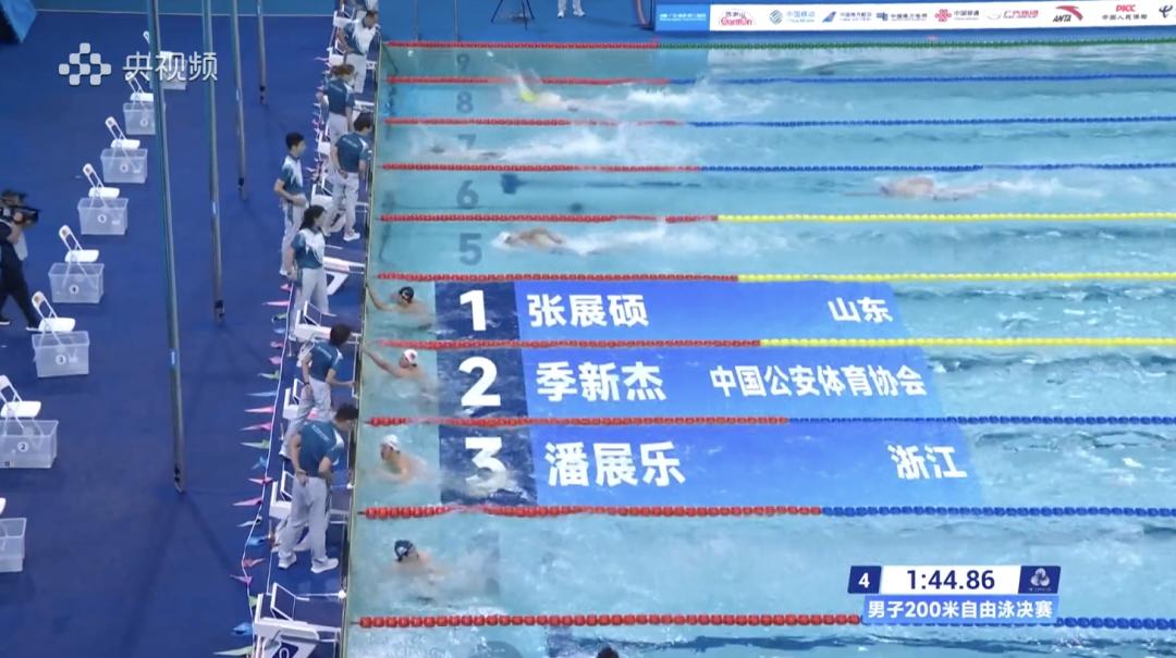 11月12日晚,第十五届全运会男子200米自由泳决赛,张展硕以1分44秒86的成绩夺得金牌,并打破全国青年纪录。季新杰获得银牌,潘展乐拿到铜牌。
