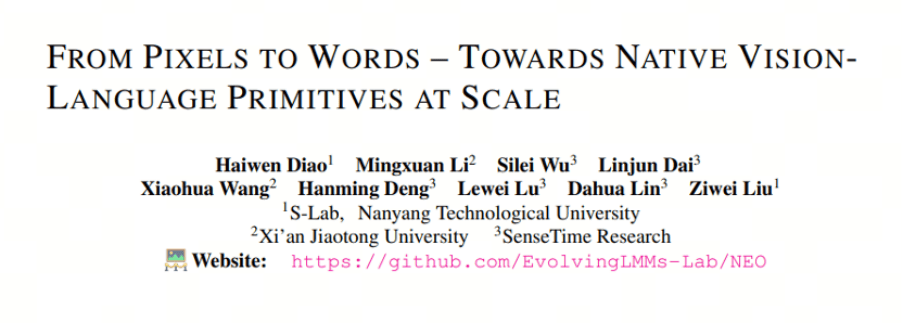 NEO架构相关论文已发布在arXiv上,题为《从像素到文字——迈向大规模的原生视觉语言原始基元(From Pixels to Words — Towards Native Vision-Language Primitives at Scale)》,商汤科技联合创始人、执行董事及AI基础设施和大模型首席科学家林达华博士,南洋理工大学S-Lab负责人、副教授刘子纬等均在该论文的作者行列。