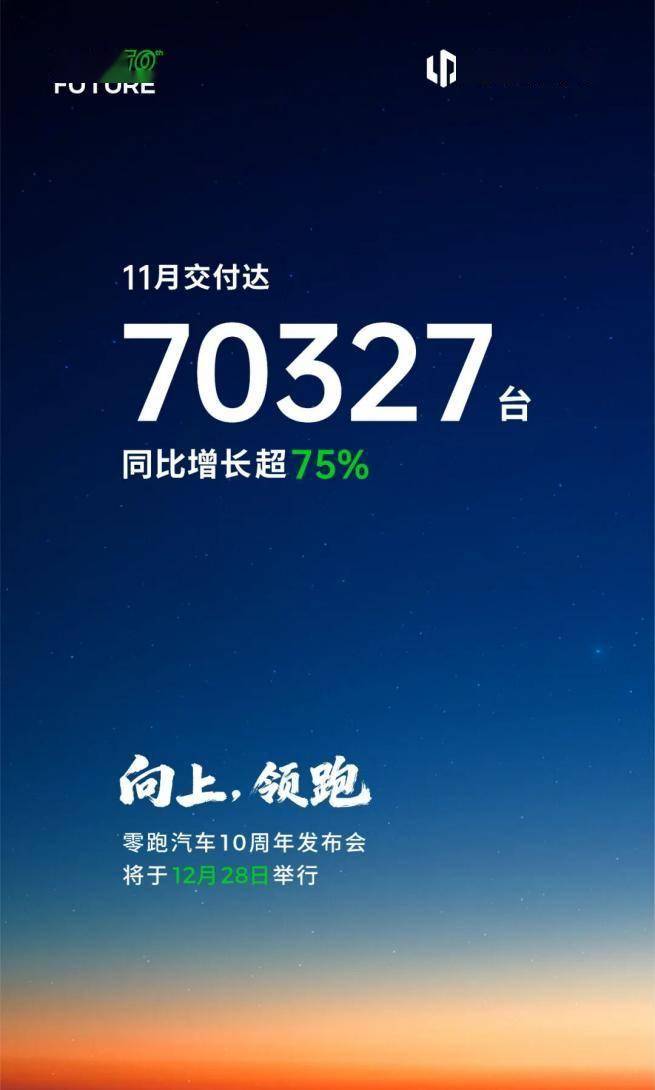 12月1日,零跑率先披露了11月月交付数据——全系70327辆的交付成绩,同比增长超75%,再创历史新高的同时,已连续九个月保持强劲增长态势。